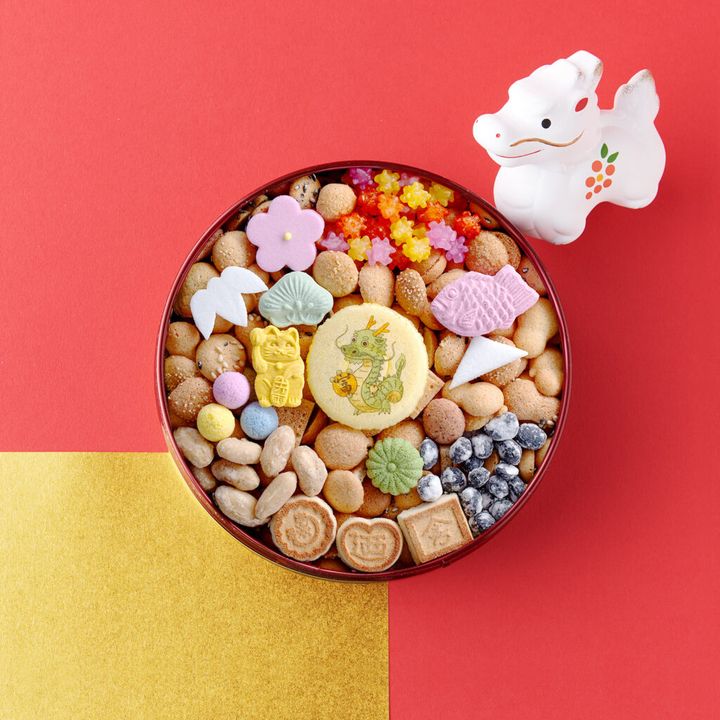 バターを使用していない和風のクッキーや、干支の辰の麩焼の他にも、鯛や招き猫、松、竹、梅など新春らしいめでたいモチーフの打ち物、金平糖など、最強の福が詰まった宝箱のような冨貴寄(ふきよせ)。カラフルで華やかなヴィジュアルと、上品ですがどこか懐かしく親近感のある味わいが楽しめ、大切な方々へのお持たせにぴったりです。販売期間は1月いっぱいまで。