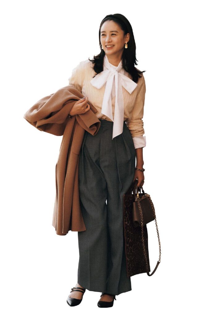 コート¥99,000(THIRD MAGAZINE)カーディガン¥35,200(スローン/ザ ショップ スローン 新静岡セノバ店)ボウタイブラウス¥37,400(ANAYI)パンツ¥23,980(ネイヴ)ショルダーバッグ¥193,600(ザンケッティ/エリオポール代官山)トートバッグ¥51,700(ア ヴァケーショ ン)パンプス¥42,900(ファビオ ルスコーニ/ファビオ ルスコーニ ジェイアール名古屋タカシマヤ店)カチューシャ¥16,500(アレクサンドル ドゥ パリ/アレクサンドル ドゥ パリ GINZA SIX店)イヤリング¥6,600(エネーダフランカ/ココシュニック新宿タカシマヤ店)ブレスレット¥9,350(イン ムード/フォーティーン ショールーム)