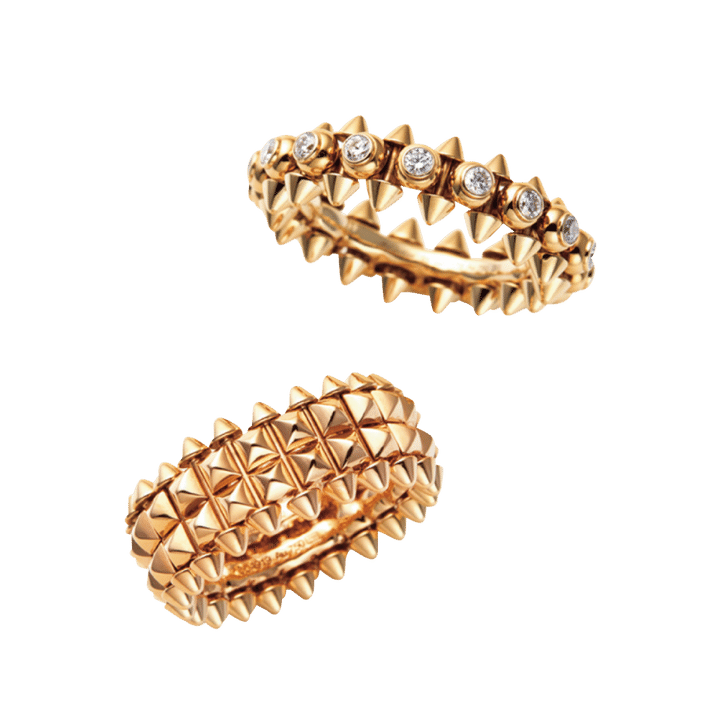 【モデル着用】既存の枠組みから脱し、新たな領域へ! そんな思いを後押しする、凜としたデザインを。上:〈クラッシュ ドゥ カルティエ〉リング[PG×DIA]¥1,452,000、下:同 リング[PG]¥643,500(全てカルティエ/カルティエ カスタマー サービスセンター)