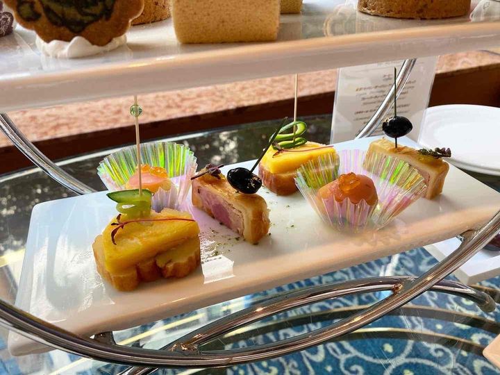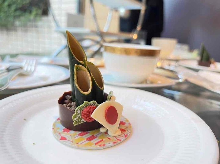 最上段にそびえ立つ門松(かどまつ)は、チョコレートでできています。断面の色合いや、紅白の花の繊細さ、金箔の上品さなど、細かなこだわりや技が感じられました。見て楽しく、食べて美味しいというのはやっぱりアフタヌーンティーの基本。それがハイレベルで表現されています。