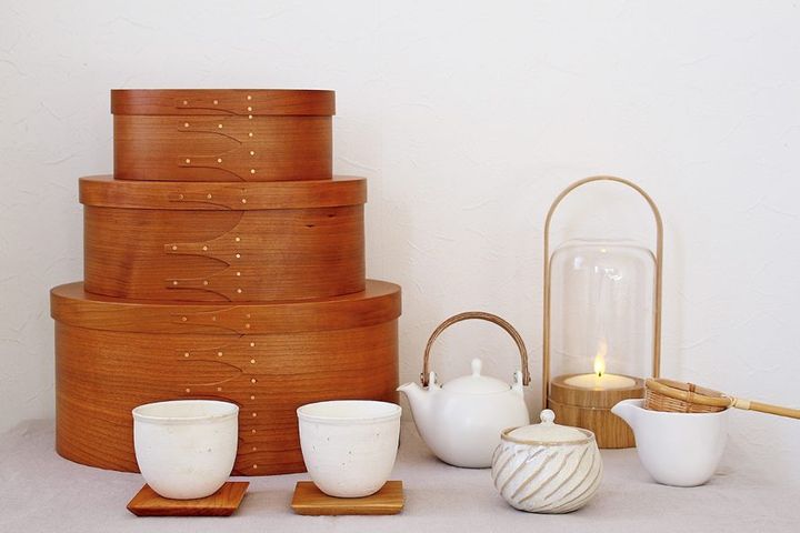 「間に合わせで適当なものを買わない、本当に気に入ったものだけを購入するようにしています。写真は今年の夏あたりにhinatalife で購入したシェーカーBOX。ひとつだけでもかわいいですが、3つ重ねるとインテリアとしての存在感が増して主役級に。お茶の道具を収納しています」