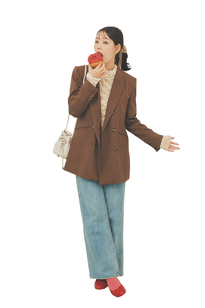 ジャケットは着回し。シャーリングトップス 10,450円/レイ ビームス(レイ ビームス 新宿) デニムパンツ 14,300円/ACYM イヤリング 6,300円/アビステ バッグ 12,650円/SAMO ONDOH(スクリーンショット) ソックス 880円/靴下屋(Tabio) バレエシューズ 14,850円/ダイアナ(ダイアナ 銀座本店) リボン/ヘア&メイク私物