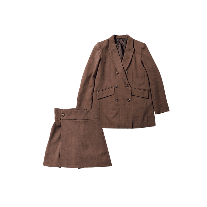ダブルボタンにラップスカート風としゃれ感たっぷり。