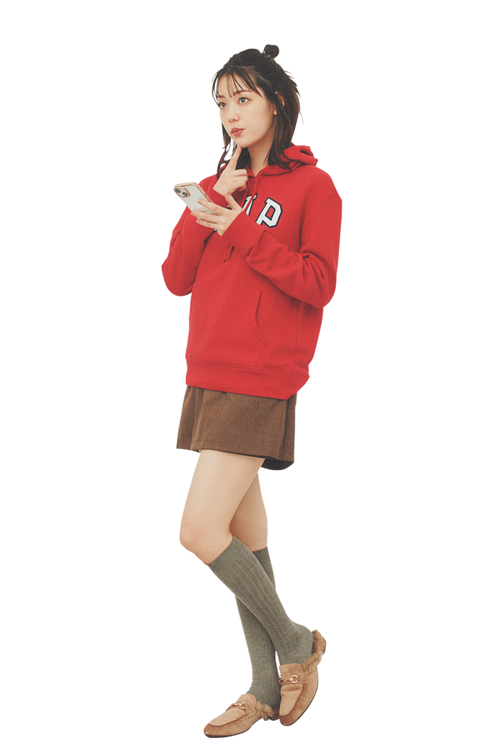 ショーパンは着回し。レッドロゴパーカ 5,990円/Gap ハイソックス 1,540円/タビオ(Tabio) ミュール 18,150円/ダイアナ(ダイアナ 銀座本店)