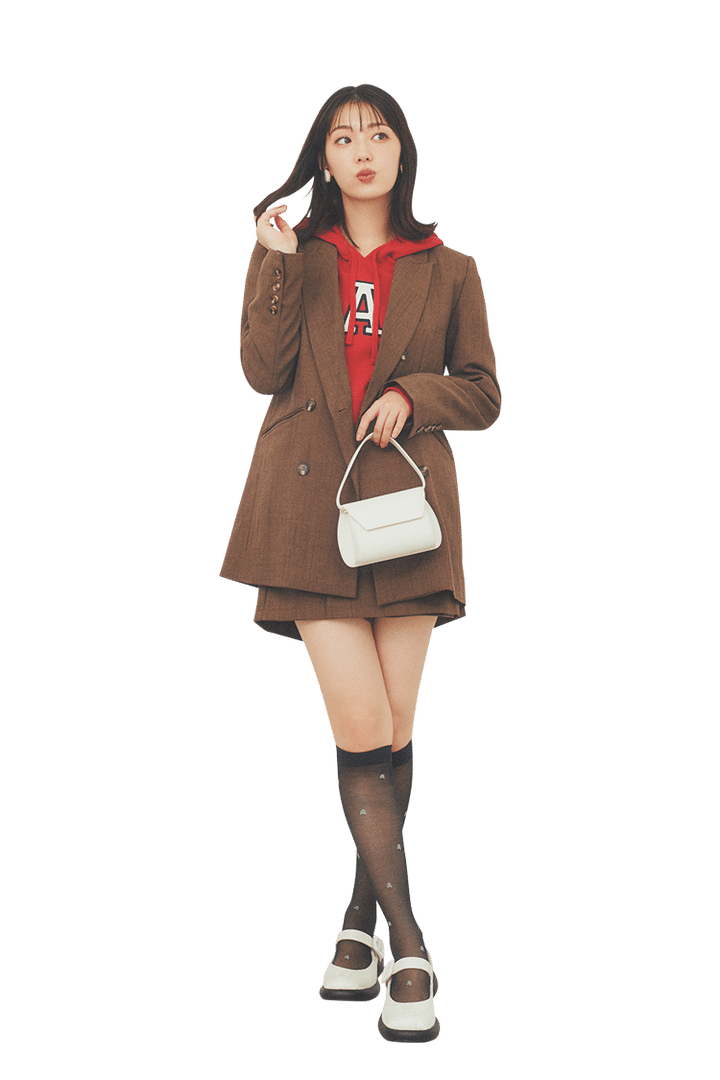 ジャケットとショーパンは着回し。レッドロゴパーカ 5,990円/Gap イヤリング 3,150円/アビステ バッグ 7,900円、シューズ 17,900円/ともにチャールズ&キース(チャールズ&キース ジャパン) ローズ柄ハイソックス 770円/靴下屋(Tabio)