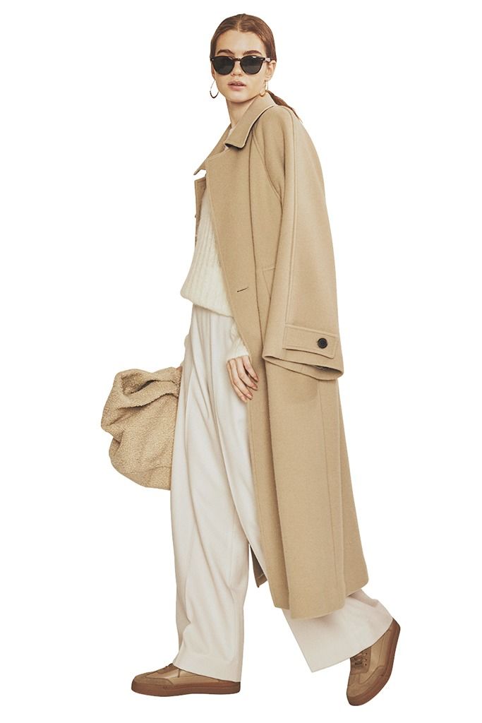 ロングコート 52,800円/ステュディオス(ステュディオス カスタマーサポート) ニット 35,200円/ギャルリー・ヴィー(ギャルリー・ヴィー 丸の内店) パンツ 49,500円/カオス(カオス丸の内) サングラス 45,760円/オリバーピープルズ(ルックスオティカジャパン カスタマーサービス) ピアス 2,860円/ミミサンジュウサン(サンポークリエイト) バッグ 23,100円/ヴァン・パルマ(ショールーム ロイト)