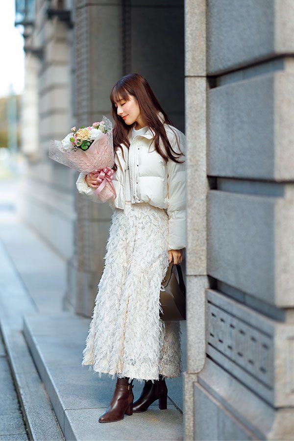 冬に挑戦したいオールホワイト。糖度高めのホワイトコーデにはカジュアルなショート丈ダウンを合わせてフェミカジュに。美人百花12月号から1月8日(月)のおすすめコーデをご紹介します。