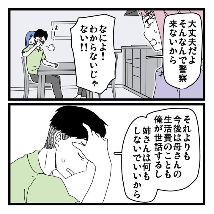 この漫画は、義母の老後資金に関する家族間トラブルを描いたものです。義母から「不自然に預金残高が減っている」と相談を受け、引き落としの履歴を調査したほぺ美さん夫婦。1000万円近いお金が不正に引き出されていることが判明し、カードの利用は停止することに。その後生活費を引き出す月末でないにも関わらず、キャッシュカードを止められたことに気づいた義姉。ずいぶん取り乱した様子で義母宅に現れました。非を認めない義姉に、ついに義母も堪忍袋の緒が切れます。山吹いろさん(@yamabuki___iro)による作品『8桁の使途不明金』第15話をごらんください。