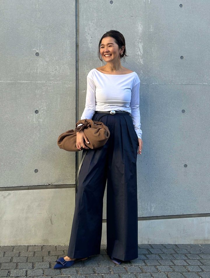 「オフショルダーにもなるワイドなボートネックで大人の肌見せに挑戦。コンパクトなトップスに合わせたのはマキシスカートのようなワイドパンツ。Aラインシルエットを意識してスッキリ見えるようにしています。ホワイト×ネイビーのコンサバな色合わせを盛り上げてくれる小物使いがポイントです」