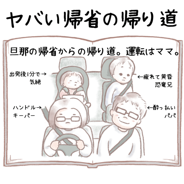 酔っ払いと疲労キッズを乗せた、帰省の帰り道。襲いかかるのは、緑色のアイツ!