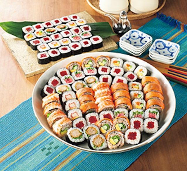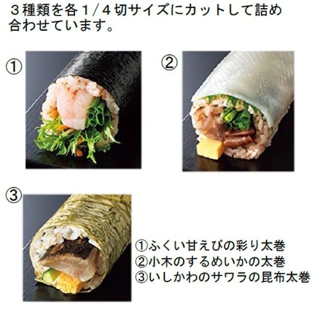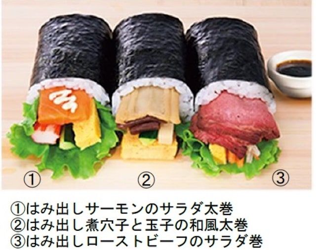 サーモン、煮穴子、ローストビーフと、年代問わず人気の具材が集結! 海苔の幅から大きくはみ出した太巻が3種類楽しめます。食べやすいハーフサイズもうれしいポイント。