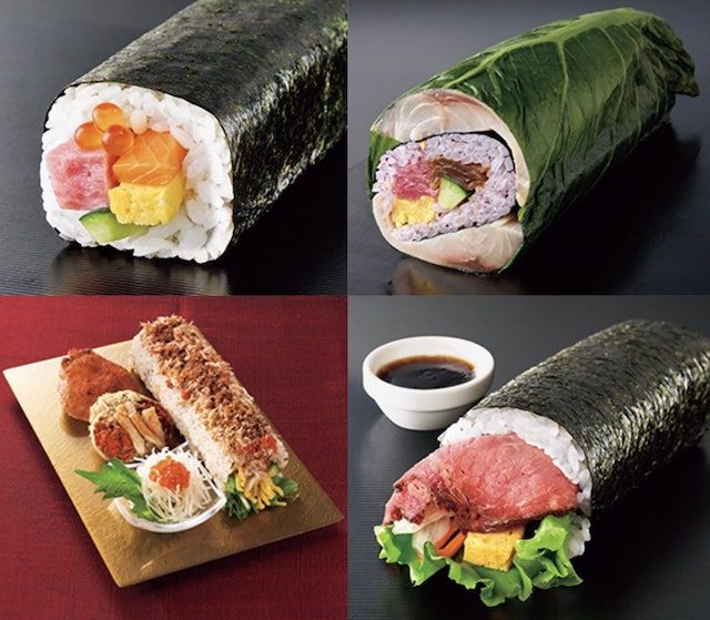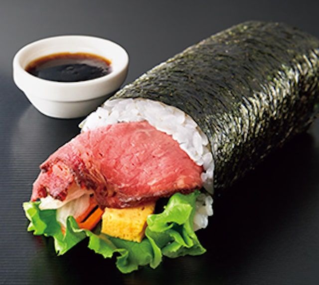 ローストビーフと野菜、玉子焼きが入った太巻。はみ出たローストビーフをわさびドレッシングで食べるのがおすすめなのだそう!