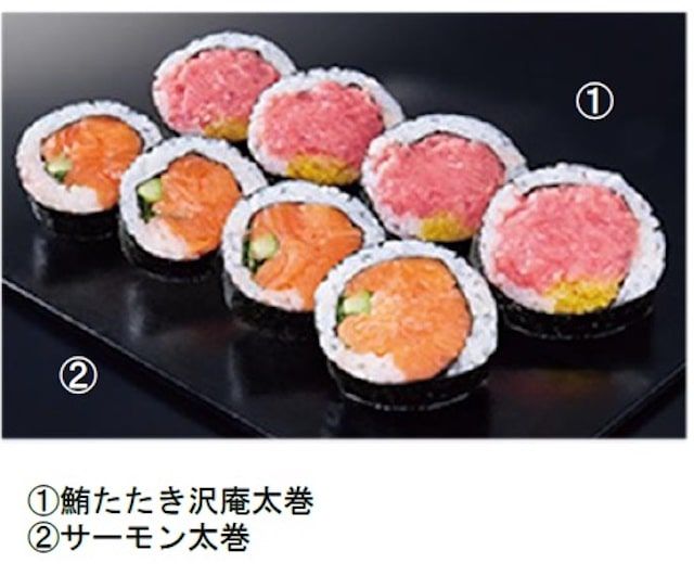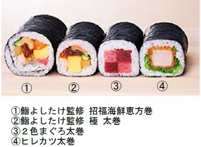 人気の銀座鮨よしたけ監修「極 太巻」「招福海鮮恵方巻」と「2色まぐろ太巻」「ヒレカツ太巻」の4種がセットに。1/3切サイズに大きさがアップし、食べ応えも抜群です!