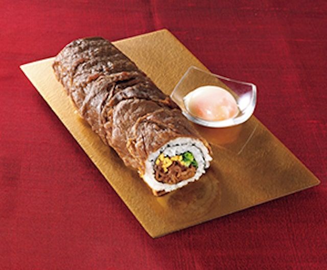 独自のタレで味付けした能登牛を贅沢に使用。付属の半熟玉子をつけていただく大満足な太巻は、自分へのご褒美にもぴったり。