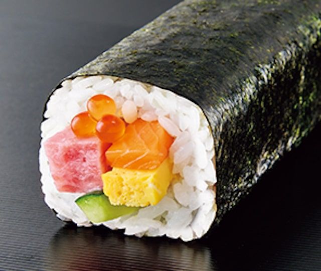いくら、まぐろたたき、サーモン、玉子、きゅうりが入った太巻です。1本にいくらを14gを使用した、コスパ抜群な一品。