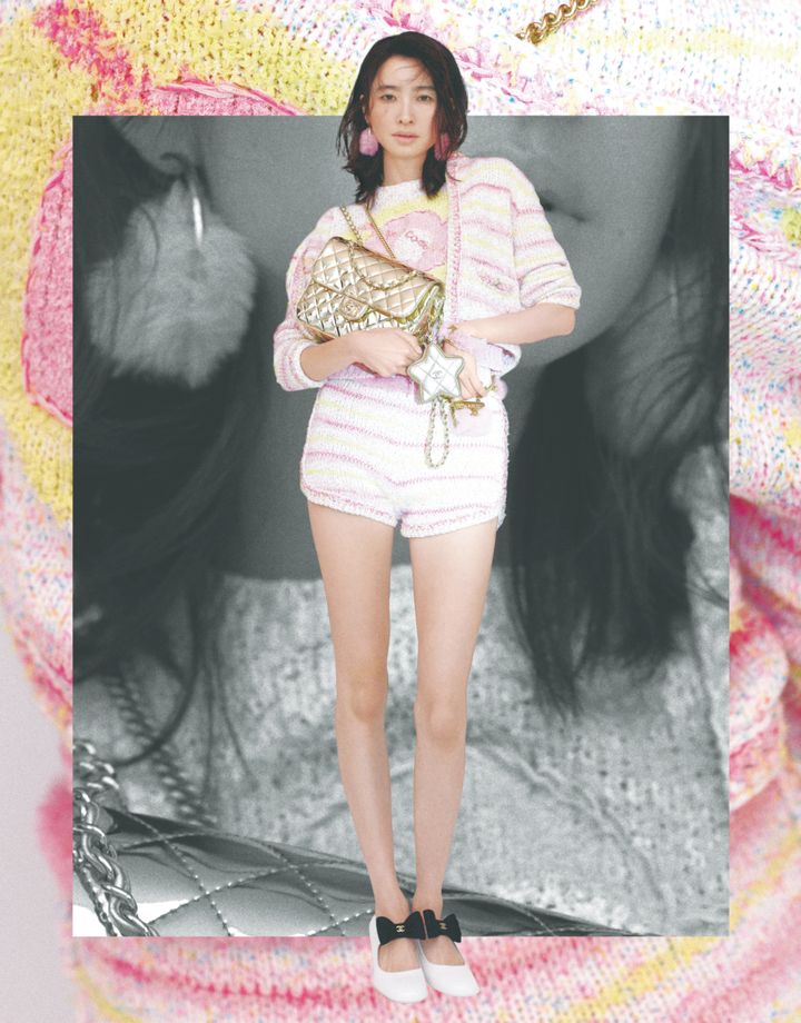 バックパック[H18.5×W23.5×D8.5㎝]¥1,123,100、ジャケット¥643,500、中に着たプルオーバー¥478,500、ショートパンツ¥388,300、シューズ[ヒール6㎝]¥214,500、ベルト¥379,500、斜め掛けしたネックレス¥394,900、ピアス¥236,500、ブレスレット¥257,400(全てシャネル)