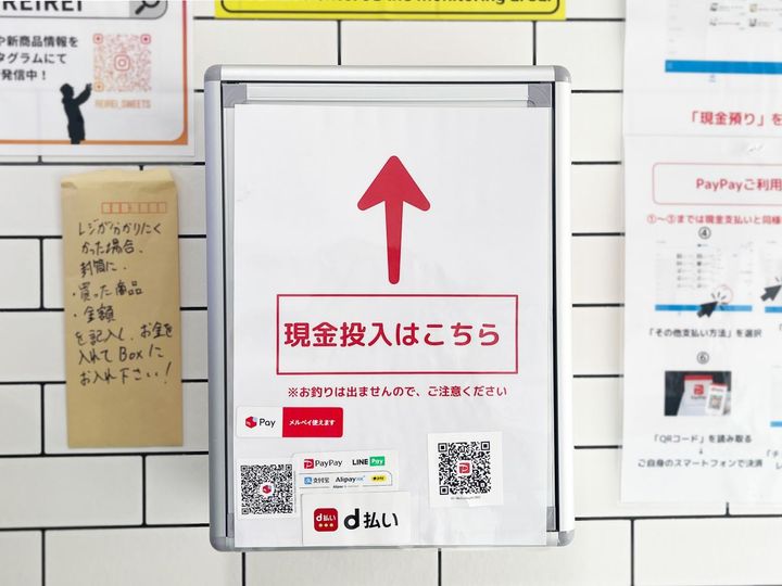 支払い方法は現金または、二次元コード決済の2種類。店内設置のタブレットで購入商品を選択し、合計金額を確認して決済します。現金はポストへ投入する方式で、おつりが出ないので注意してくださいね。