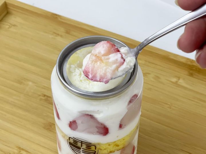 缶詰めの蓋を開けると、中にはぎっしりと詰められたショートケーキが。クリームやスポンジは甘さ控えめ、イチゴは酸味があり、さっぱりとした味わいです。見た目以上に軽い口当たりで、最後まで飽きずに食べられますよ。