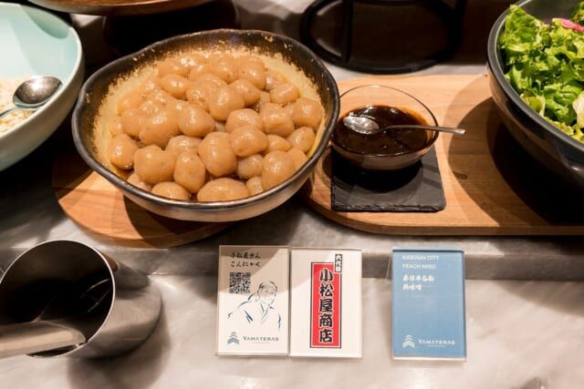 犬山の城下町で180年続く手作りこんにゃくの名店「小松屋商店」の玉こんにゃくを用意。2023年春には同店の六代目倉地秀幸氏が黄綬褒章を受章。加えて、愛知県春日井市のご当地味噌で、桃の果肉が入った「桃味噌」でいただくと、さらにローカルな味を楽しめます。