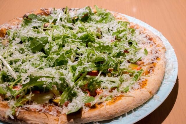 まさに地元の味を楽しめる「ネイバーフッドPIZZA」。自家製のピザ生地には、三河ポークのハムやパプリカ、茄子、ししとうなど、愛知県を中心に、木曽川対岸の岐阜県産もそろえます。犬山の農家で獲れた水菜もたっぷり盛られ、パルメザンチーズがかかります。もちろん季節によってトッピングなどの野菜が変わるのも、楽しみのひとつです。