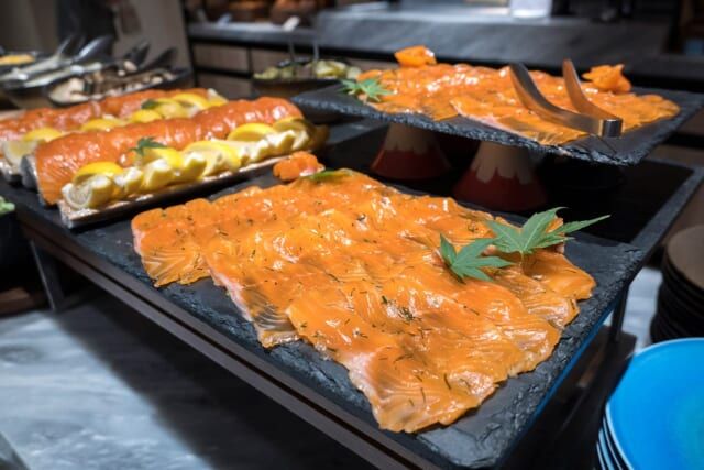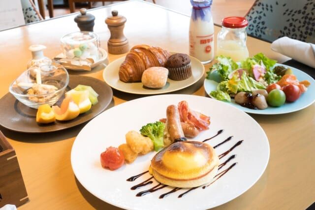 朝食は、メイン料理を和朝食か洋食のアメリカンセットから選び、その他サラダやパン、ドリンクなどはブッフェテーブルからフリーでいただけます。組子細工のトレーで運ばれる和朝食が人気ですが、洋食も高級な仙寿卵を使ったエッグベネティクトなど、どちらも大いに迷うほど魅力的です。