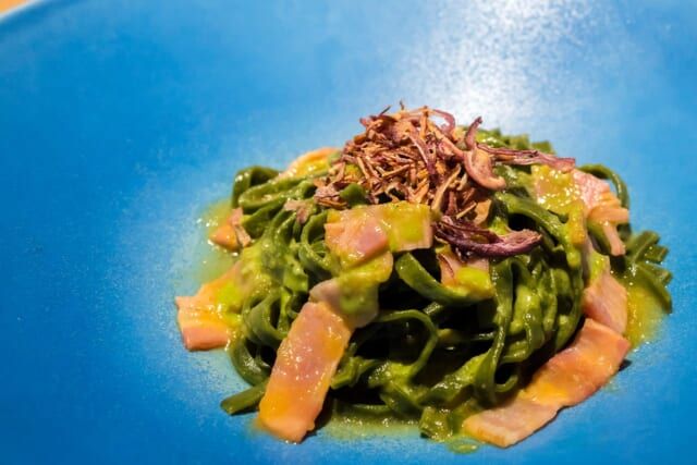 地元「犬山茶」を練り込んだ濃い緑色のパスタは、黄色のトマトを使ったチリトマトのソースと、抹茶を使った生クリームのソースで、緑と黄色、ベーコンの赤と、食慾をそそる色彩が豊か。モチモチの生麺はお茶の風味が際立ち、トマトソースともよく合います。食べておきたい逸品です。
