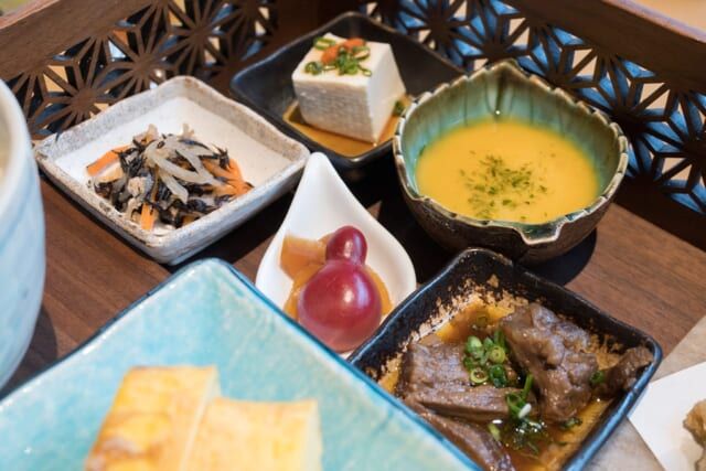 ▲牛のしぐれ煮や豆腐など、様々な味の小鉢が並びます