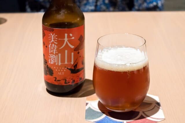 豊富にそろうドリンクの中から、犬山に本社がある「犬山美偉瀏(ビール)」をチョイス。犬山城と鵜飼をモチーフにしたラベルも見どころです。ルビー色が美しいピルスナーは、すっきりとした味わいで飲みやすく、料理ともよく合いました。