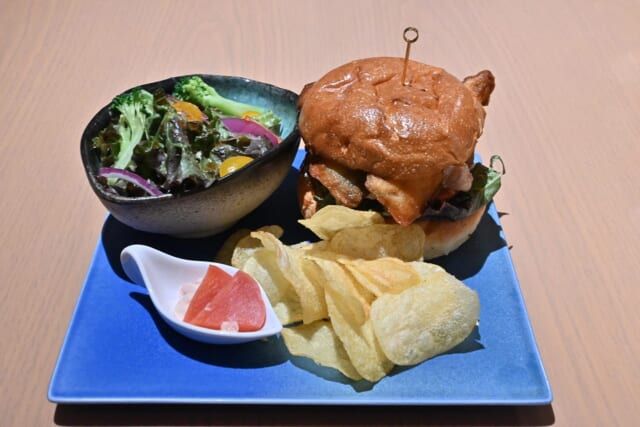 鵜飼を思いながら食べられるグルメバーガー「鮎カツバーガー」こそ注目。この日は三河産の鮎を使ったカツがサンドされ、初めはそのままでかぶりつき、途中から岐阜県高山産の赤カブを使ったホテルオリジナルのタルタルソースで酸味をプラス。さらに添えられたポテトチップスはトリュフ風味。ビールにピッタリの一品です。