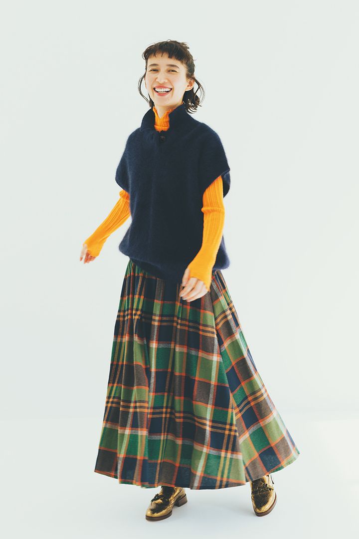 ニットベスト¥20,900/スティーブン アラン(スティーブン アラン シンジュク)、ハイネックセーター¥20,900/アンフィル(アンフィル)、スカート¥4,990/ヴィオラ エ ヴィオラ(ヴィオラ エ ヴィオラ)、ソックス¥3,520/マルコモンド(ドロワー)、シューズ¥44,000/オッカ(プライムビアンカ)
