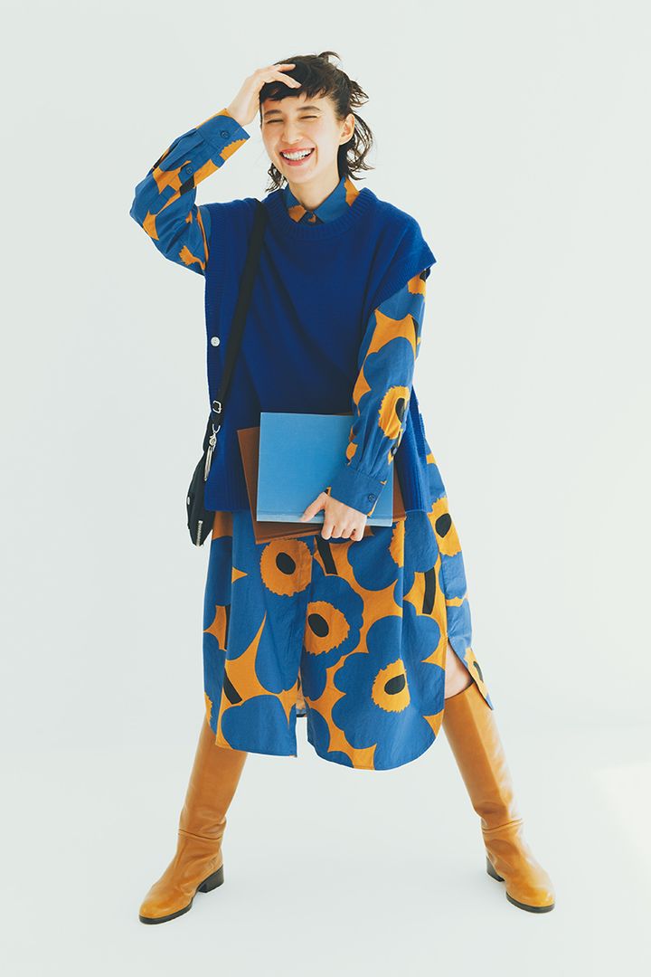 シャツワンピース¥53,900/マリメッコ(ルック ブティック事 業 部 )、ニットベスト¥19,800/アデュートリステス(アデュー トリステス)、ブーツ¥50,600/スティーブン アラン(スティーブン アラン シンジュク)、バッグ¥30,800/ロドリリオン(ネペンテス ウーマン トウキョウ)