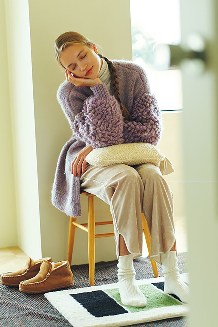 ニットガウン¥29,700/ピュール(ピュール)、タートルネックニット¥24,200/フィルメランジェ(フィルメランジェ)、パンツ¥36,000/ユウバエ(ユウバエ)、オーガニックコットンの湯たんぽカバー¥9,790/グリュックントグーテ(グリュックントグーテ)、ルームシューズ¥18,700/エル・エル・ビーン(エル・エル・ビーン カスタマーサービスセンター)、スモールラグ¥44,000、マルチカラーラグ¥58,300/ともにルーマー(アルファ PR)、ソックス/スタイリスト私物