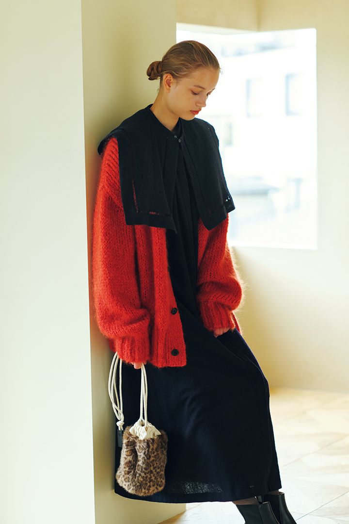 カーディガン¥81,400/08サーカス(08ブック)、セーラーカラーワンピース¥39,600/ロワズィール(ロワズィール)、バッグ¥18,700/テンベア(テンベア トウキョウ)、ブーツ¥70,400/ビューティフル・シューズ(ギャラリー・オブ・オーセンティック)、タイツ/スタイリスト私物