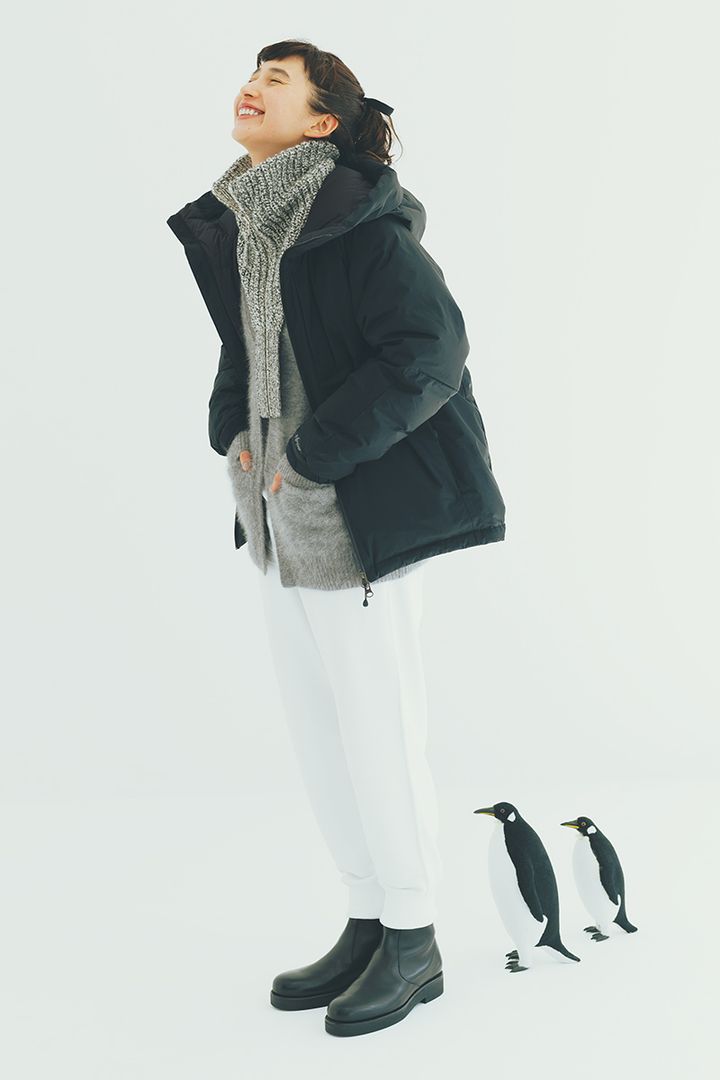 ダウンジャケット¥44,000/ナンガ(ナンガ)、ネックウォーマー¥28,600/アンフィル(アンフィル)、セーター¥19800/ノンブルアンペール(ノンブルアンペール吉祥寺パークストア)、ジョガーパンツ¥9,130/ブリング(ブリング エビス)、ショートブーツ¥75,900/ビューティフルシューズ(シップス インフォメーションセンター)