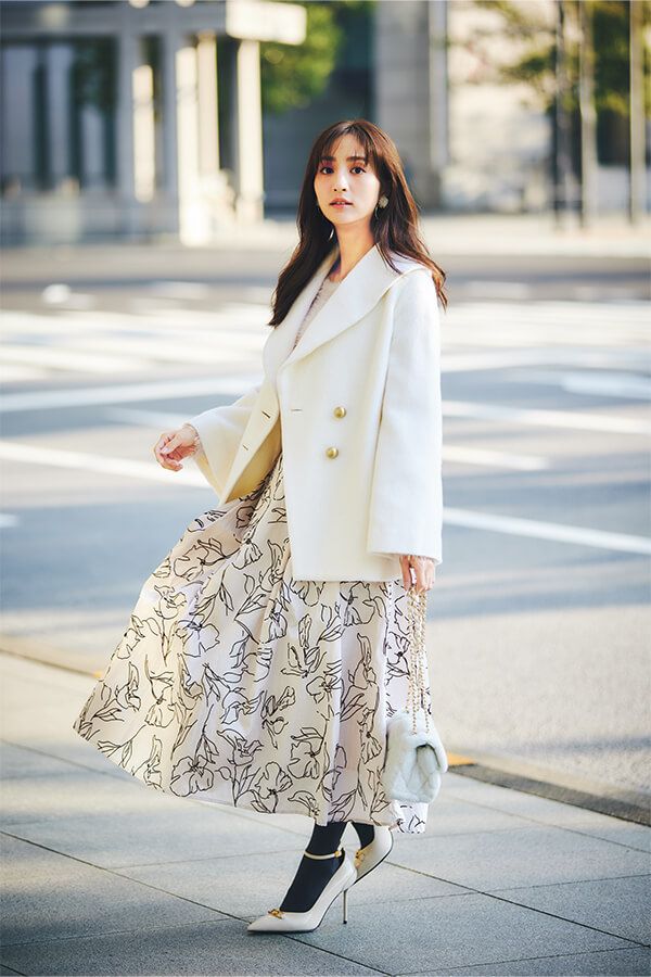 暖冬の今年はハーフ丈コートに視線が集中! 大人のスカートコーデに合わせたいのが、白×金ボタンのシンプルなコート。フェミニンな花柄スカートとも好相性で、コーデがぐっと洒落る♪ ハーフ丈ならそのベーシックな見た目で着回し力の高さも約束。