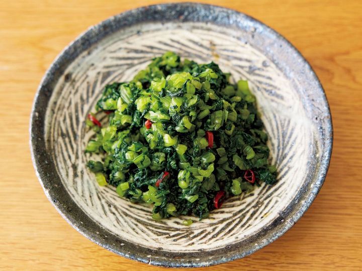 シャキシャキとした食感&ほどよい塩けで、ご飯がどんどんすすむ『小松菜の高菜漬け風』。