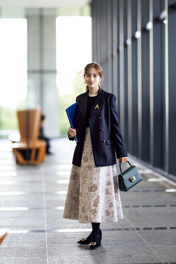 きれいめなテーラードジャケットにアクセの装飾でレディな着映え感をプラス。淡いカラーの花柄スカートなら、落ち着いた大人の華感を演出できます。