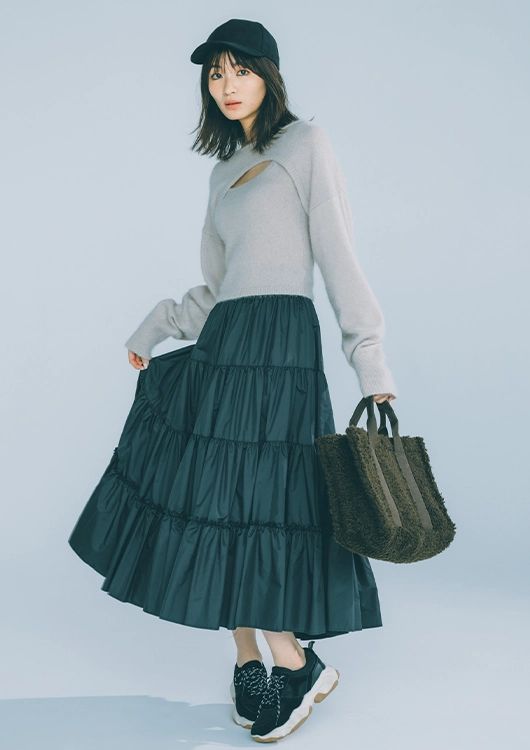 ニット×ニットキャミソール(セット販売)¥13,200/ココディール ティアードスカート¥28,600/シーニュ キャップ¥10,780/ルーニィ バッグ¥40,150/フランソワレニエ(ヤマニ) スニーカー¥2,970/神戸レタス