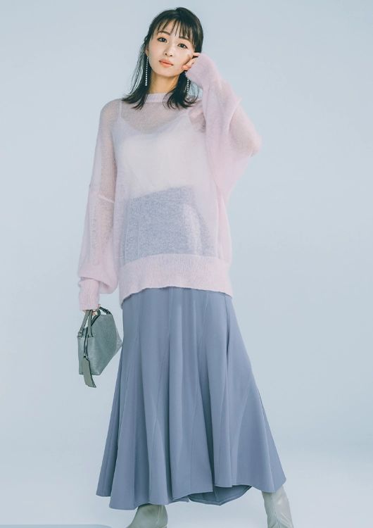 シアーニット¥17,600/カデュネ マーメイドスカート¥12,100/MERCURYDUO(MERCURYDUO ルミネエスト新宿店) ピアス¥12,100/masae(ロードス) バッグ¥34,100/ジャンニキアリーニ(ジャンニキアリーニ銀座店) ショートブーツ¥25,300/ダイアナ(ダイアナ銀座本店)