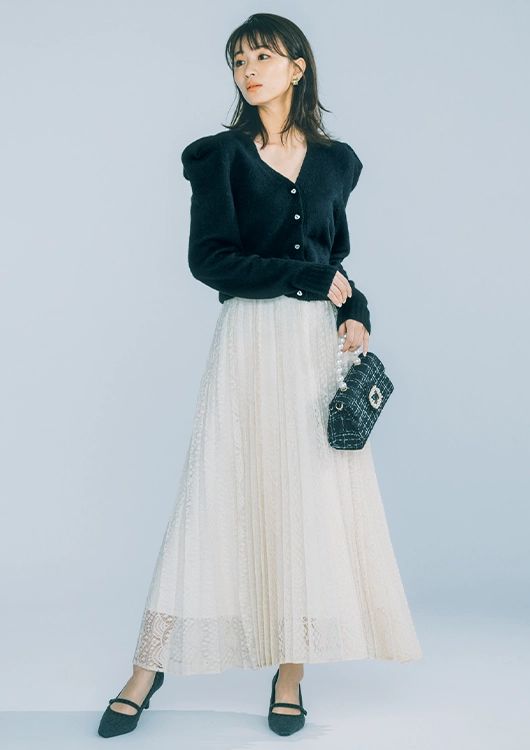 ニットカーディガン¥30,500/シーニュレース プリーツスカート¥25,300/マイストラーダ イヤリング¥2,640/アネモネ(サンポークリエイト) バッグ¥11,990/RANDA パンプス¥8,900/CHARLES&KEITH JAPAN