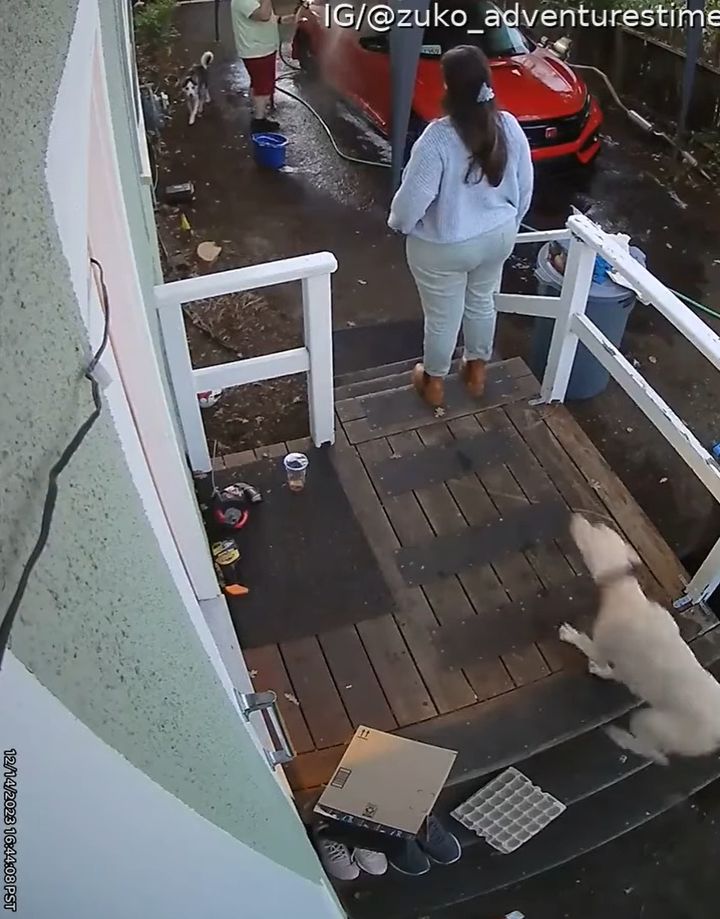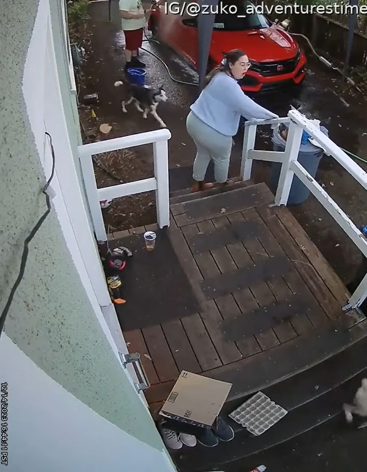 次の瞬間、女性の背中に思い切り飛びかかりました!! 飼い主さんと一緒に遊びたかったようですが、この時女性がいたのは階段の前。