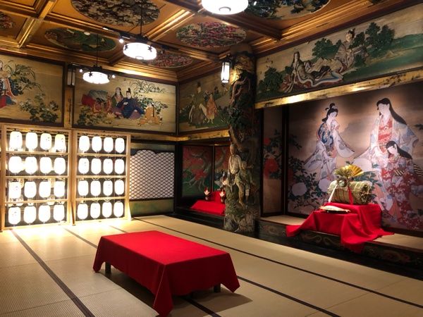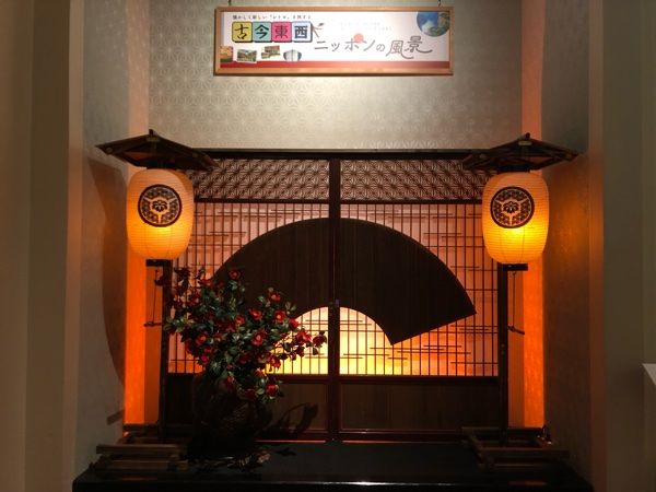 文化財「百段階段」の雅な雰囲気のお部屋が一昔前にタイムスリップしたようなレトロな旅館の佇まいとなっています。暖簾をくぐるとここから始まる旅先の景色は、祭りの風景、東北地方のこけしや玩具、架空の温泉街のネオンサイン、観光地の店先の風景などが愉しめる展示となっています。