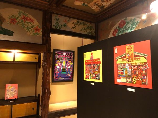 静水の間ではイラストレーターの中村杏子氏の作品集『郷愁的商店街図集』『家内幸福』より、想像上の商店街や建物を描いたデジタルイラストを大型パネルで展示されています。カラフルでレトロポップな作品です。静水の間は、重厚な格天井の設えに描かれている橋本静水、池上 秀畝(いけがみ しゅうほ)の日本画も見どころのひとつです。