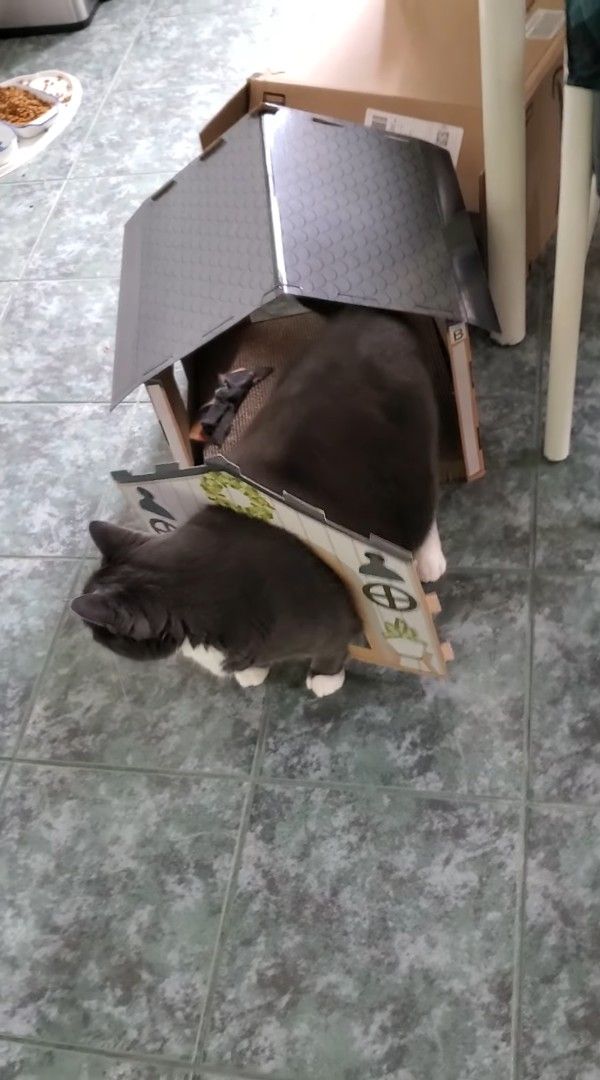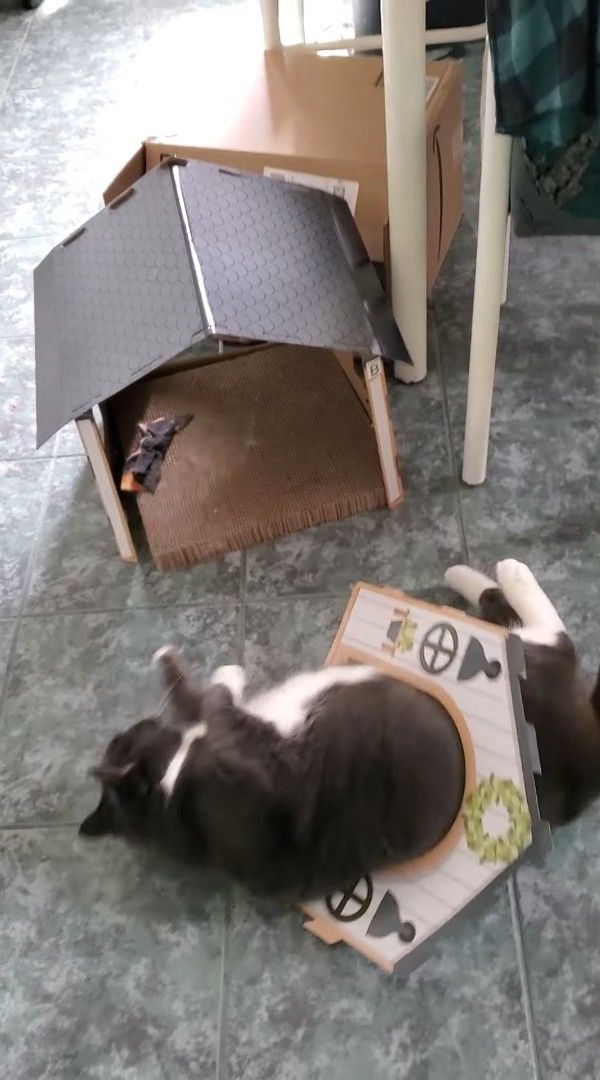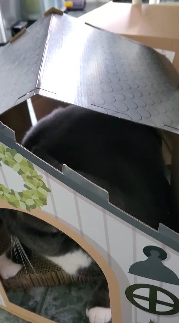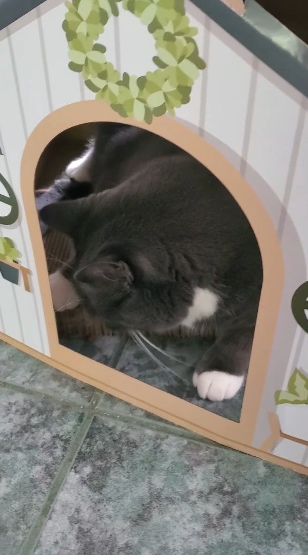 ダンボールでできたお家の中にいた猫。 この子が外に出ようとしたところ・・・、ハプニングが!!