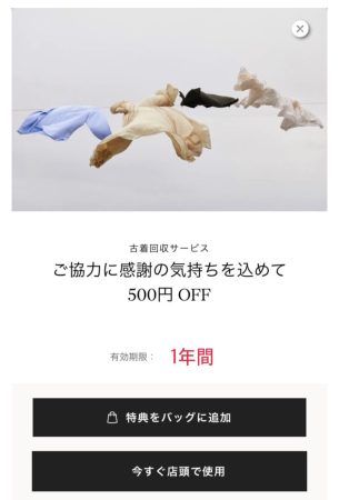 (靴やアクセ、革製品以外)ブランド問わず衣類やシーツなどのテキスタイルを店舗に持ち込むと1袋500円OFFのクーポンがもらえちゃう。 ※1日2袋まで交換OK、1回3,000円以上で1枚使用OK