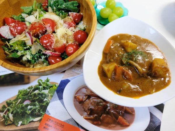 30日は、「ミニハンバーグデミシチュー」と「たっぷりケールのチーズナッツサラダ」、シャインマスカットにプラスでごはん、前日の残りの五目ひじき、漬物。