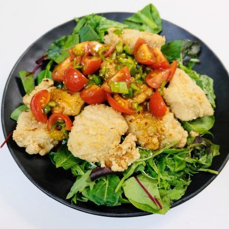 大晦日の日は、年越しそばも食べるから、あんまりいっぱいいらないなーと思って、「チキンフライのサルサ風」にルッコラを加え、プラスでごはん、味噌汁、タラバガニ!統一感ナシ