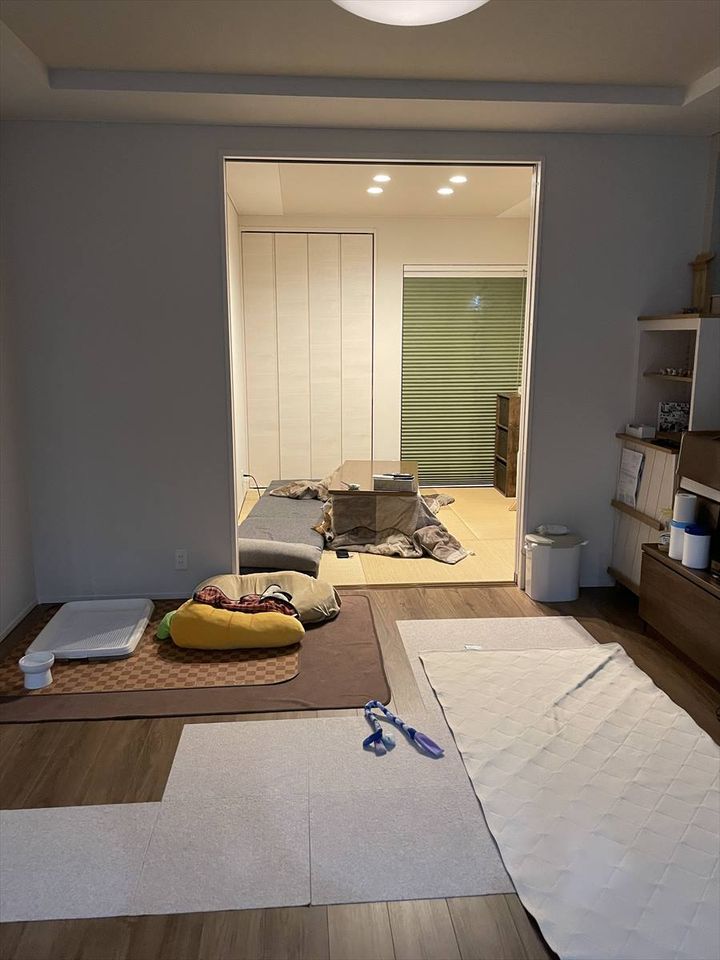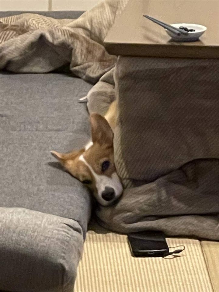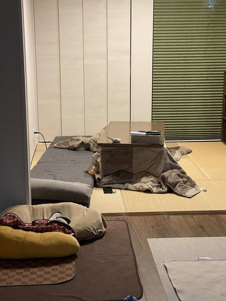 すっかり部屋と一体化しているコーギー。 いったいどこにいるのか、姿を探してみてください!!