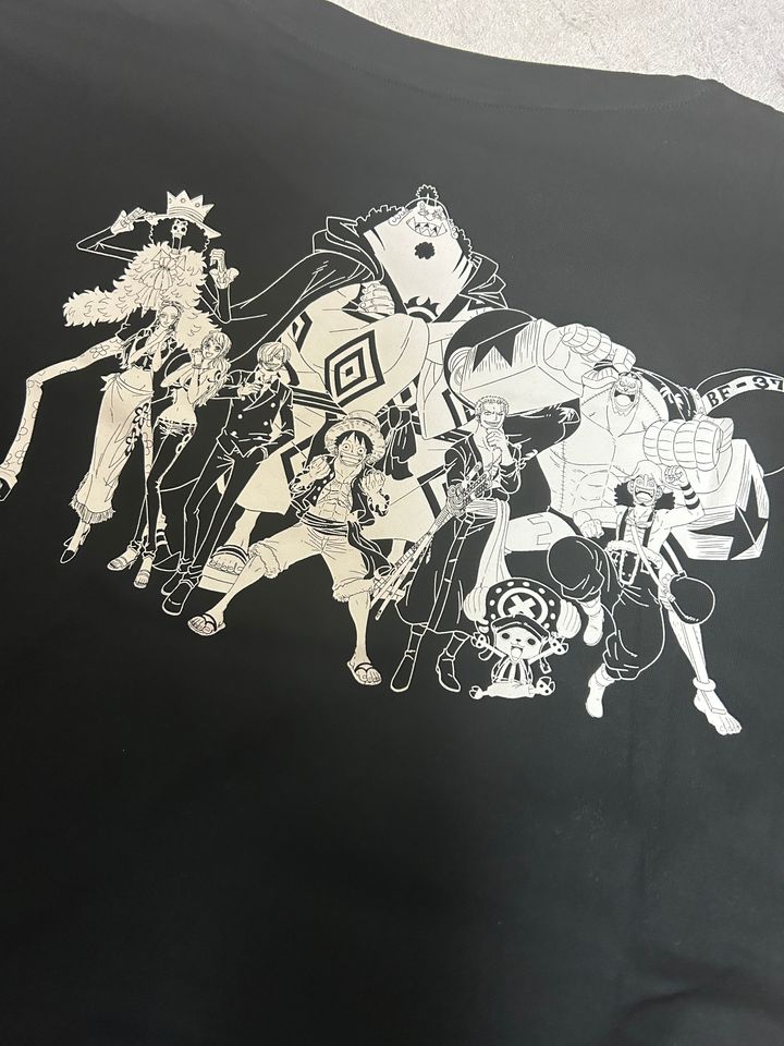 ジンベエが揃った麦わらの一味がバックプリントされたシンプルなTシャツ。