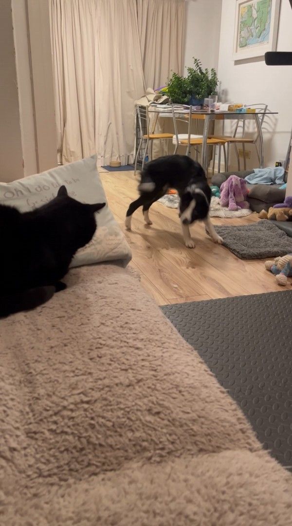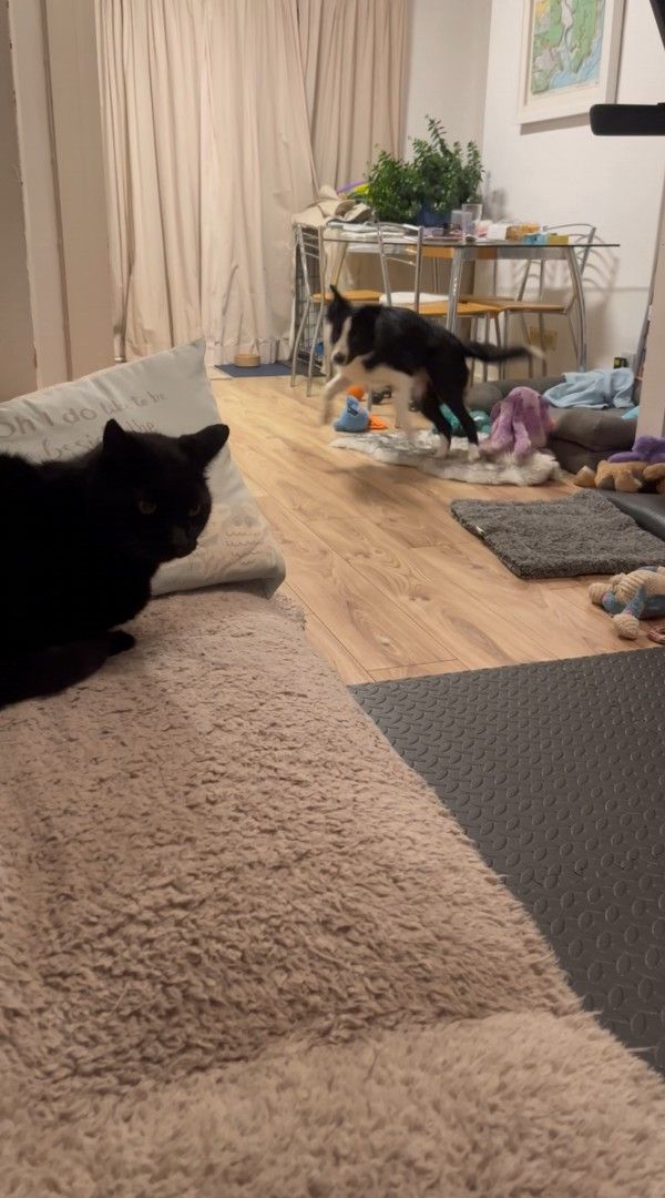 動画が撮影されたのは、とあるお宅のリビング。 こちらのお宅で暮らす、生後5ヶ月のボーダーコリーの子犬と猫の姿を捉えた映像です。